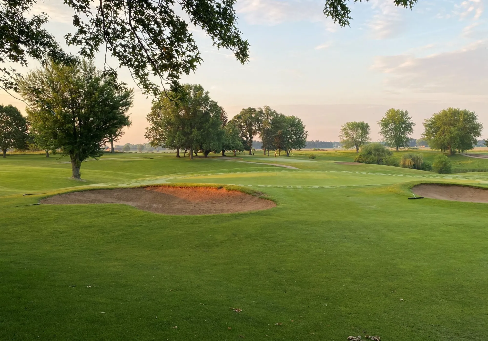 Straight out with sand bunkers located on each side of the green.